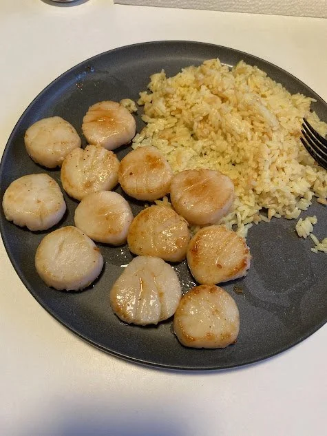 Get olive oil heated in pan on stove top medium/High heat. Pick off scallops sweet meat (the little hard pieces on the side of scallops, not on all scallops sometimes they fall off on there own). Sear one side of the scallops for about 1.5mins then flip. Once flipped add butter, minced garlic and thyme and baste scallops for remaining 1.5mins. Do not over cook scallops they will get tough. Scallops can be eaten raw so better to leave undercooked. Serve immediately!
